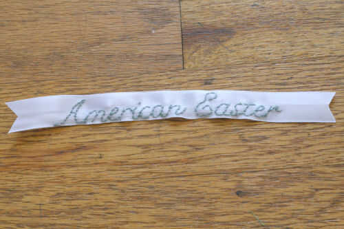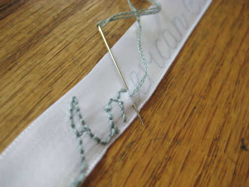-Trazar las letras en la cinta con puntos de sutura de seda del bordado. Usé una hilera de puntadas simples para completar mi sello.