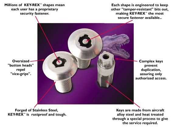 [[br]] Bryce sujetador pone una gran cantidad de investigación y desarrollo en el cierre de Key-Rex™ con la intención de hacer un bloqueo. Formas de Key-Rex™ se crean a través de un proceso de "cifrado" que hace una forma de millones de variables y define la "clave" por cada parte. Este "código de tecla" se asigna a un usuario individual. Los millones de variaciones claves garantizar que cada licencia Key-Rex™ es privado y exclusivo para el propietario. Requiere una clave perfectamente fabricada para operarla. Rechaza toda seguridad poco consejos y vice apretones.