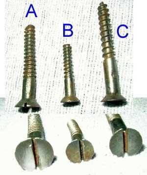 En la foto con 3 tornillos viejos, el tornillo de la izquierda (A) fue hecha a mano a finales del siglo XVIII. Tenga en cuenta el punto plano en el eje, los hilos irregulares, punta Roma y el centro de ranura. El tornillo en el centro (B) es a máquina alrededor de 1830. Tiene afilados, incluso hilos, forma cilíndrica, extremo romo y la ranura está todavía descentrado. El tornillo a la derecha (C) es un moderno tornillo gimlet, 1848, con eje de inclinación, incluso hilos, punta y ranura centrada.