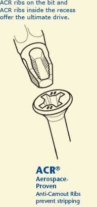 [[br]] también de la compañía del tornillo Phillips y muy similares un Phillips Square-Driv® más el añadido ACR® Anti-Camout costillas. Tiene todas las ventajas de la Phillips Square-Driv®. ACR® es para reducido camout, confiable adhesivo y alto par. Las cabezas de los tornillos están marcadas con señales doble como se muestra. [[br]]