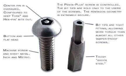 [[br]] la geometría de Penta-Plus™ hace que sea más seguro que todos otros tornillos prueba de manipulaciones. Penta-Plus™ es propiedad de sujetador de Bryce y configurado para mantener Torx-pin y pedacitos de tratar de forzar-resistente hexagonal perno hacia fuera. Otros tornillos hermética han poco consejos vendidos en el mercado abierto. Penta-Plus™ se vende solamente por Bryce sujetador para mantener su integridad como un tornillo de alta resistencia de alta seguridad. Penta-Plus™ ha demostrado que tratar de forzar-resistente y a prueba de vandalismo en algunas de las situaciones más extremas (asegurar ordenadores portátiles en los quioscos abiertos) sin falta. Al lado de la cerradura de seguridad de Keyed-Lok™, este es el tornillo de prueba de manipulaciones más en el mercado.