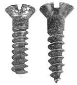 El tornillo de la izquierda (A) fue hecha a mano a finales del siglo XVIII. Tenga en cuenta el punto plano en el eje, los hilos irregulares, punta Roma y el centro de ranura. El tornillo en el centro (B) es a máquina alrededor de 1830. Tiene afilados, incluso hilos, forma cilíndrica, extremo romo y la ranura está todavía descentrado. El tornillo a la derecha (C) es un moderno tornillo gimlet, 1848, con eje de inclinación, incluso hilos, punta y ranura centrada.