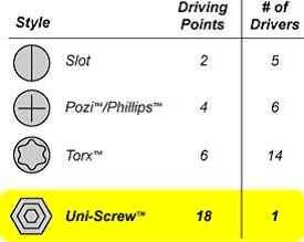 Sitio web afirma Uni-tornillo para ser el primer conductor para conducir los tornillos imperiales y métricos, virtualmente elimina camout y desmontaje, positivo de control con ajuste de palo y aumento de la productividad. Otros beneficios incluyen la necesidad de solamente un conductor sobre una amplia gama de tamaños de tornillo y fácil alineación del controlador para atornillar.