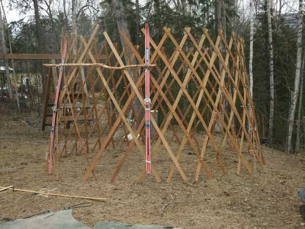 Buscar un amigo a verticalmente cuando usted atado todo apagado.   Atar los postes algunos ski etc.... a los extremos para formar una puerta y casi tienes una yurta.        VAMOS a ver!