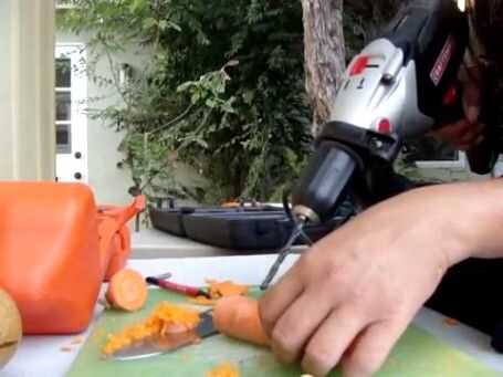 Mantenga la zanahoria delante de usted con el lado superior de la zanahoria hacia arriba.  Necesita perforar un orificio con la broca más pequeña, un poco abajo de la parte superior de la zanahoria.  Elegí un punto que terminó siendo aproximadamente una pulgada hacia abajo del lado.  He encontrado que si vas demasiado lejos abajo, el sonido no es muy bueno.