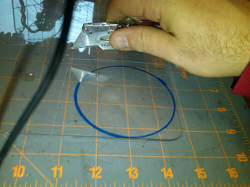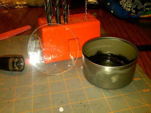 Puede usar la tapa de atún y sharpie traza un círculo sobre el Plexi... Acerino de corte con la herramienta rotatoria y fibra de vidrio cortada a disco. cambiar a tambor de lijar y cuidadosamente la arena los bordes todo el camino hasta llegar a su línea de sharpie. Pruebas para ajuste de vez en cuando. Una vez que se adapta a su "tapa" que desea utilizar un papel de lija fino para acabar los bordes un poco. Tuve una larga "tapa" que os adjunto a un mandril que encajan en mi taladro. (se utiliza una gran gota de pegamento caliente) Luego pegué las dos "tapas" con pegamento de caucho. (no utilice pegamento caliente para mantenerlos juntos. Es hasta difícil de conseguir de su acabado "tapa"