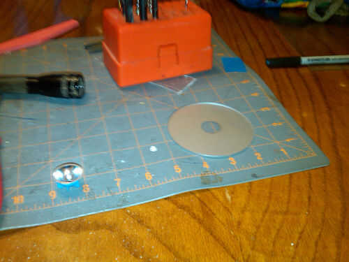 Ahora quería el plexi tener un final del espejo y pensaban que la pintura de acento americano plata tenía funcionaría. No pero es lo que tenía. Roció la parte inferior de la tapa pero necesitaba una parte no pintada en el centro del tamaño del reflector de luz mag que recuperado las piezas aprovechables. He probado algunas cosas pero terminó cubriendo el centro de la tapa con una arandela que era apenas más pequeña que la abertura del reflector de cono. Utilicé una pinza y poco chatarra artesanía de espuma para asegurarse de que la lavadora no se movía. Entonces aerosol pintado a dos capas de pintura de plata.