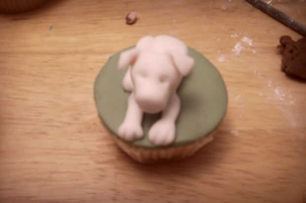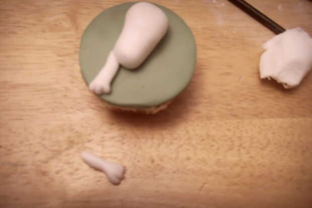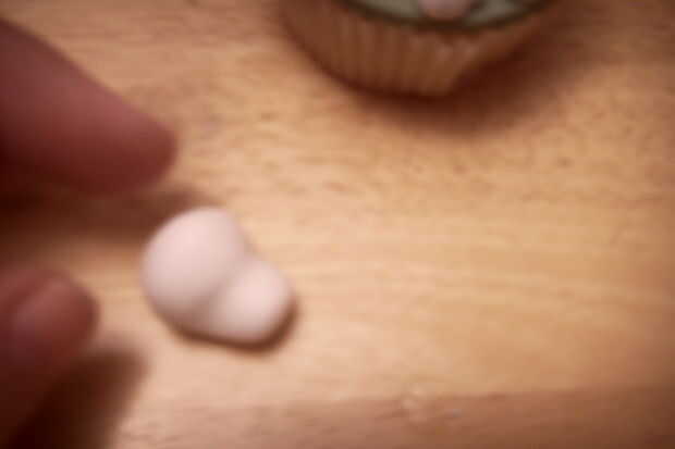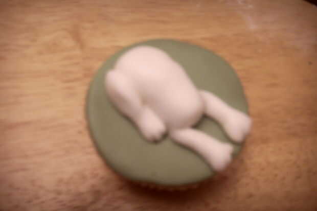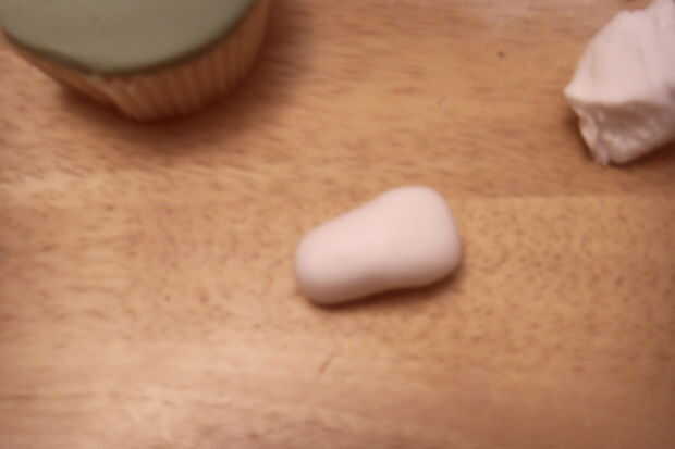 Rodar una pelota mediana de pasta de azúcar blanco en forma de pera. Se trata de su cuerpo. Coloque en el centro de la torta de la taza, use una pequeña cantidad de agua en su pincel para pegar si es necesario.