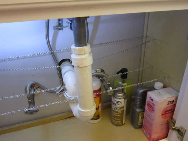 Con los alicates, corte la cadena a aproximadamente una pulgada menos que la anchura interior de la vanidad. Enganche el extremo izquierdo de la primera cadena sobre el gancho trasero izquierdo, luego lo cadena en el gancho trasero derecho. Atornille el gancho trasero derecho en hasta que la cadena se tensa. Repita con las otras cadenas, que se desplaza al frente y de derecha a izquierda. Por último, asegúrese de que todos los ganchos están mintiendo horizontalmente, por lo que no capturan en lo que se sitúa sobre las cadenas.