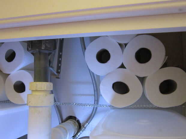 El papel higiénico es recogido en el espacio en forma de torpeza al lado del lavabo, dentro de la tapa de la vanidad. Asegúrese de que no se obstruyan las obras del tapón del fregadero.