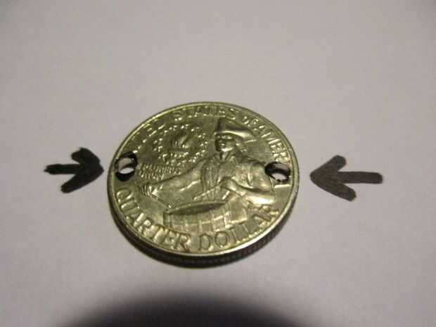 Mi papá me prestó una perforadora que golpea básicamente cualquier material que se ajuste dentro de sus mandíbulas mal (pero útiles). Así sucedió con las monedas, no hay problema. (He usado en mi instrucable pendiente de penny, aquí hay una foto)