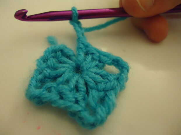 Repita este proceso (3 puntadas de doble crochet, puntadas de cadena 3) todo hasta hay 4 sets de doble crochet (12 puntos) y de 3 esquinas. No se olvide de terminar con una cadena de 3. También en este punto, cortar lo que quedaba de mi cola partida.