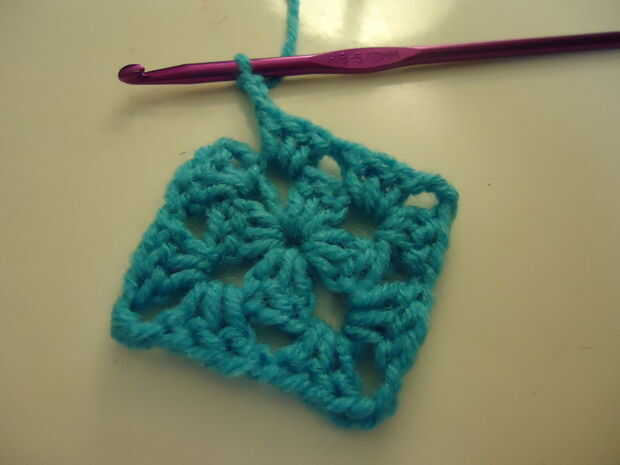 Continuar este camino todo el camino alrededor. (Doble crochet en grupos de tres, de la cadena 1 punto entre ellos cuando están en el mismo lado de la Plaza, cadena 3 puntos entre ellos cuando estás haciendo una esquina.) Usted debe terminar con 8 sets de puntadas de ganchillo doble (24 puntos).