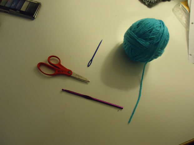 Necesitarás hilo de estambre de peso (no negro), una aguja de zurcir/hilo, tijeras y un ganchillo de crochet del tamaño G-J.