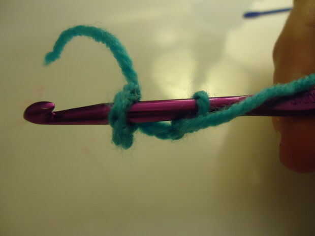 Envolver el hilo por lo que es en el lado izquierdo del gancho. Estirar el anillo un poco para que puedan ver una abertura lo suficientemente grande para su gancho entre las puntadas de cadena. Inserte el gancho en este agujero, puede que tenga que gire hacia los lados como en la imagen para que su gancho es horizontal.