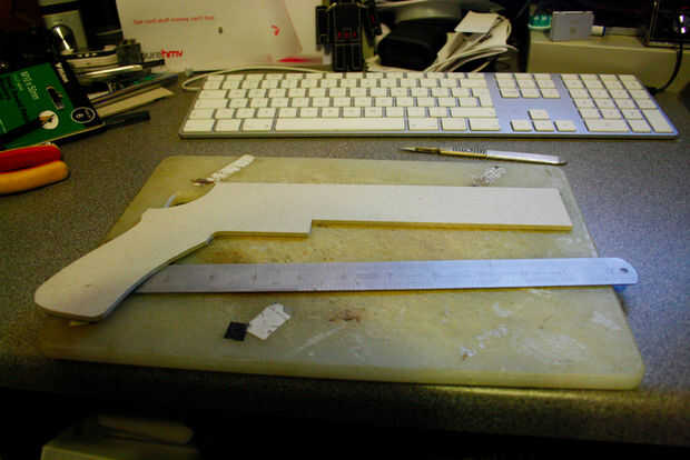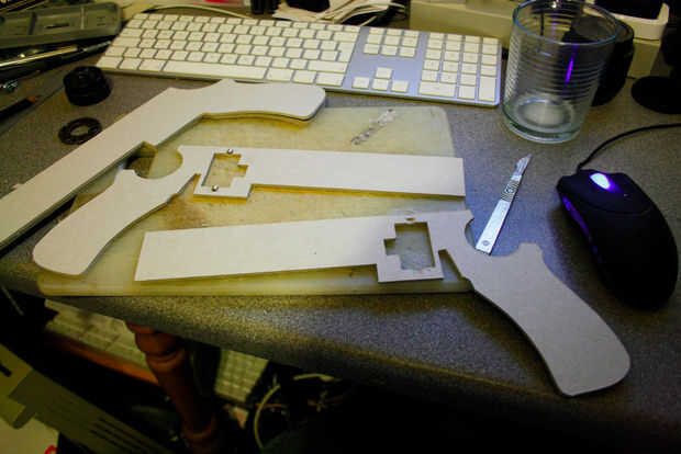 Comencé dibujando la forma del arma en papel, asegurándose de hacer espacio para la cámara. Dependiendo de la profundidad de su tarjeta de cortar bastantes secciones para el grueso de la pistola, la sección más delgada del apoyo es la sección de que la cámara se encuentra en, por lo que aquí es donde debe medir de profundidad.