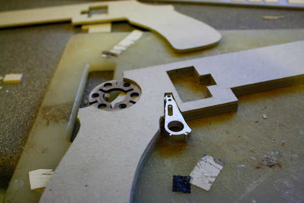 En este punto que hice algo que no hago a menudo, planeé por delante; Sabía que necesitaría incorporar un gatillo y un martillo en algún momento, así que hice los agujeros antes de pegar las capas.