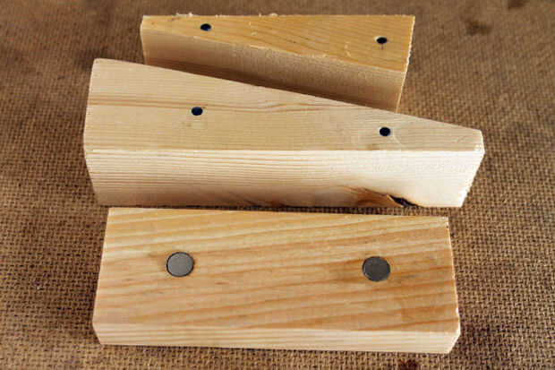 Alteré su diseño en un par de maneras. En primer lugar, he hecho el labio un poco más grande así el tope del rack puede estar encima de la mordaza de un lado por sí mismo. En segundo lugar, en vez de pegar los labios a las cuñas, hice solo un labio y dos cuñas, con imanes en el labio y las uñas en las cuñas para mantenerlos junto (Foto 1).