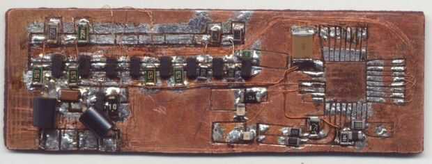 Los pads del chip fueron estañados en la preparación de la soldadura en posición.