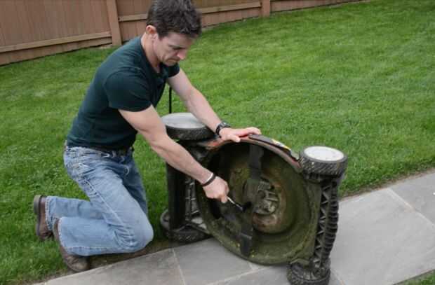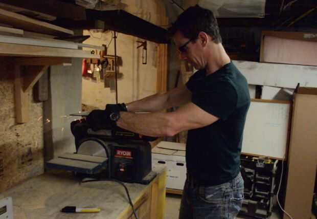 Cuchillas funcionan mejor que los mates en cada cortadora de césped en el universo. Antes de atornillar de la hoja, saque el cable de la bujía. Digamos que una vez oí una historia sobre un chico que no. Él hizo girar la pala, el motor comprime una vez y, bueno, Hola zurdo... De todos modos, me gustaría enfocar en una estación de lijar (el mío es un Ryobi). Coincidir el bisel de la hoja de la cortadora de césped a la banda y luego afilar. Use protección para los ojos.