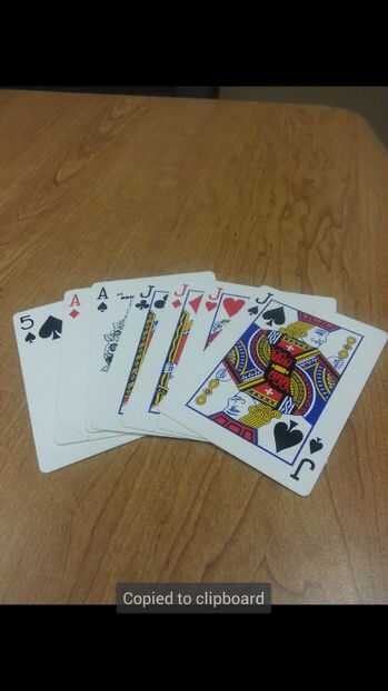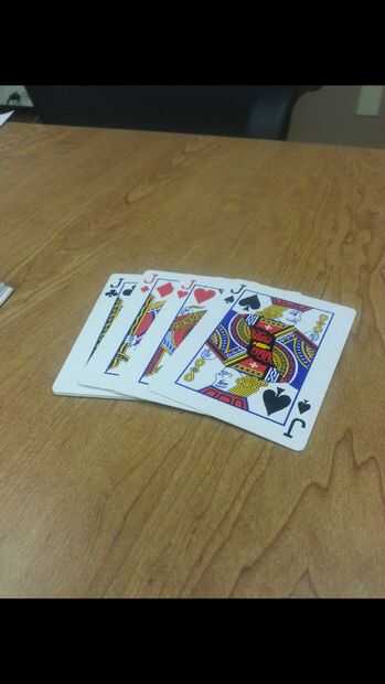Usted necesita quitar las cuatro tomas de la cubierta, LATIGADORES así puede ver las cuatro y luego 3 cartas en la parte superior del gato superior, pero directamente detrás de él para que el público no puede decir existen.