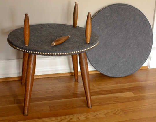 Después de un viaje y un tropiezo, soporta media de la tabla vino deshecho. Se puede reparar pero tuvo una vida más para vivir como un otomán tapizado.