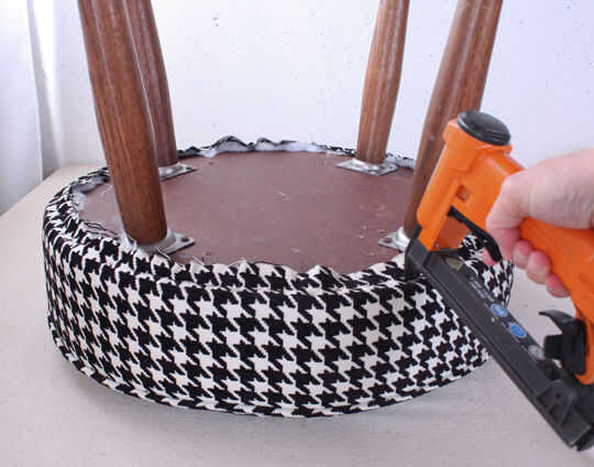 Añadir una capa de guata sobre la otomana de espuma coronada. Deslice la cubierta cosida en la parte superior del otomano y tire uniformemente todo alrededor mientras fijándolo con grapas, manteniendo la cubierta lisa todo el camino alrededor.