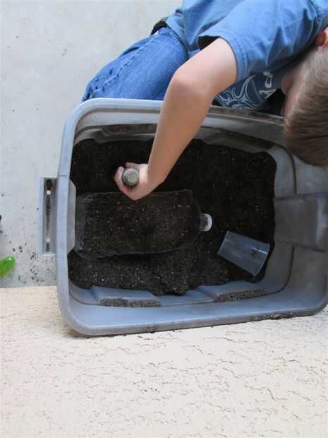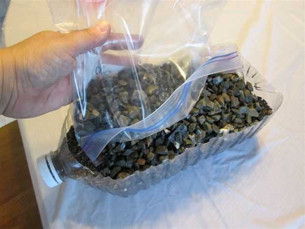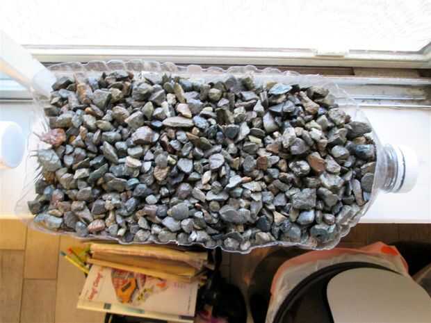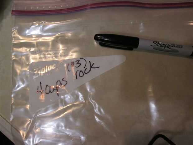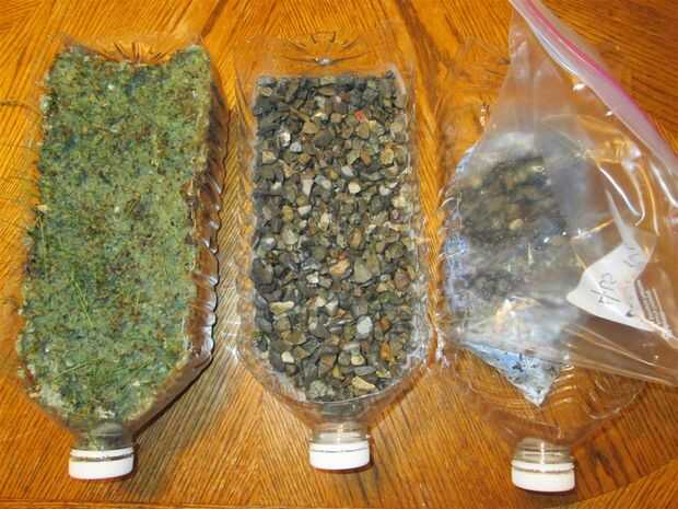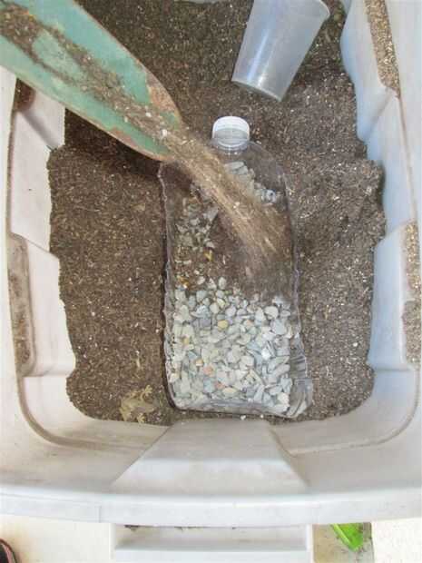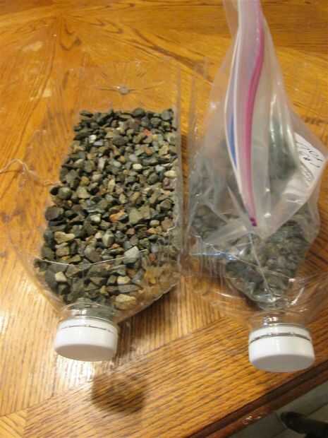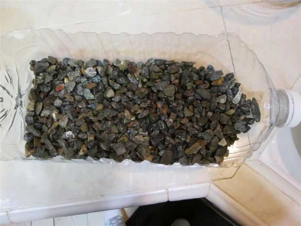Este segundo caso, la parte inferior la mitad del recipiente estaba lleno de suciedad, mientras que la parte superior la mitad estaba lleno de 4 tazas de la roca de tamiz de tamaño 3.