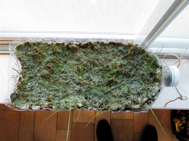 Preparado y me plantaron la mezcla de semillas/pelusa de hierba en uno de los tres contenedores, un mes antes de la reunión que íbamos a tener.