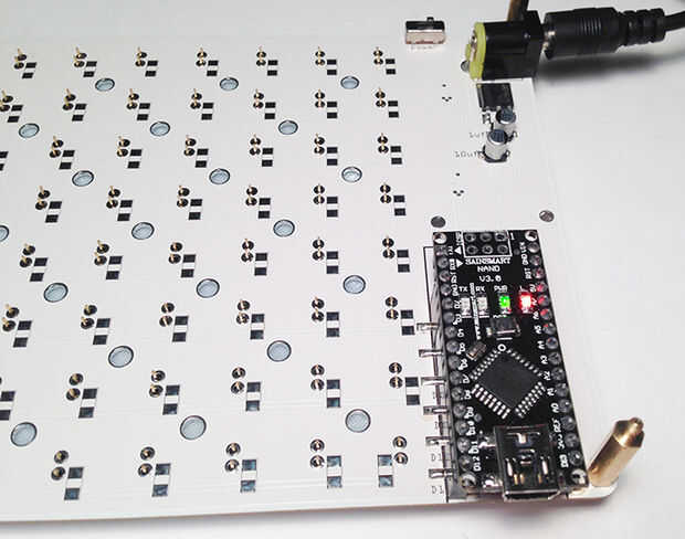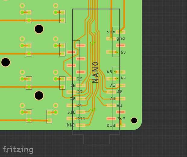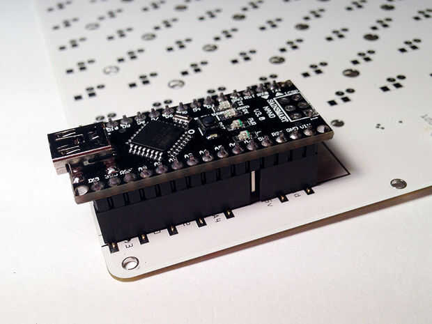 La soldadura de los cables de exterior, luego retire (con cuidado) el Arduino Nano de los headers hembra por lo que se puede soldar el interior rastros. Cuando todo se suelda, relplace Arduino y ya está listo para pasar!