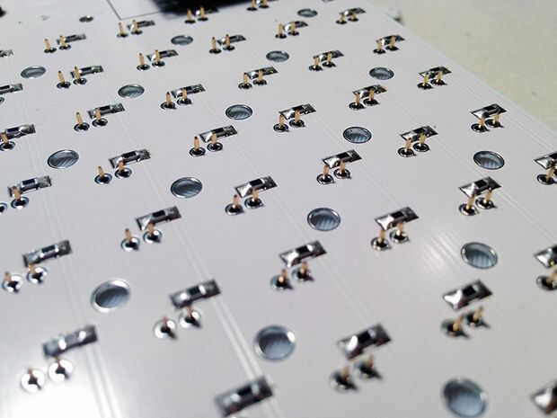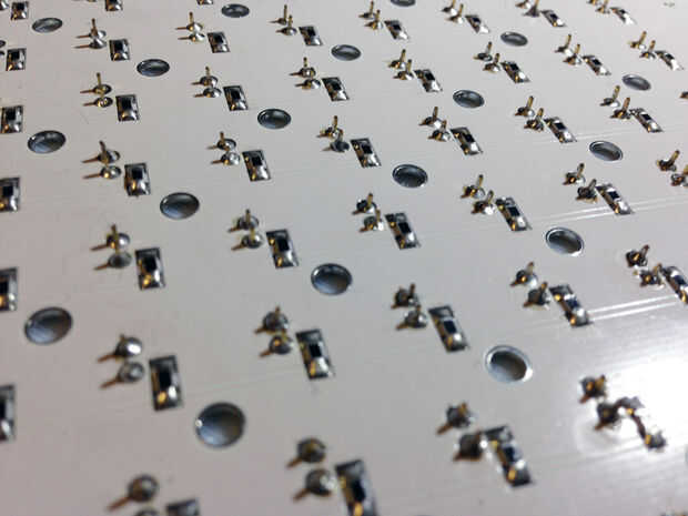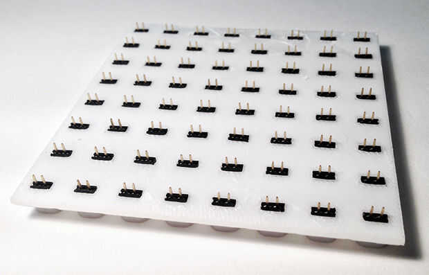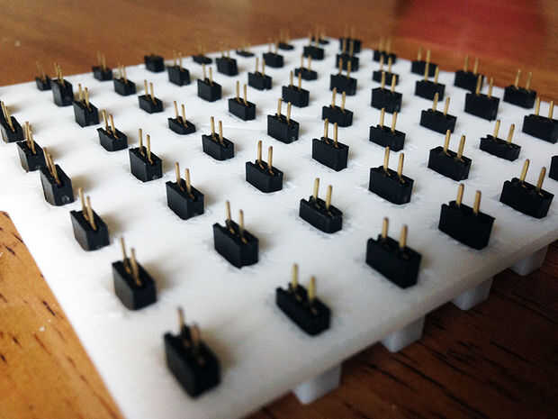 Una vez rellenada, los leds de los encabezados de mujer se alineará perfectamente con los orificios de la placa de circuito Cubecube. Simplemente pop a través y de la soldadura!