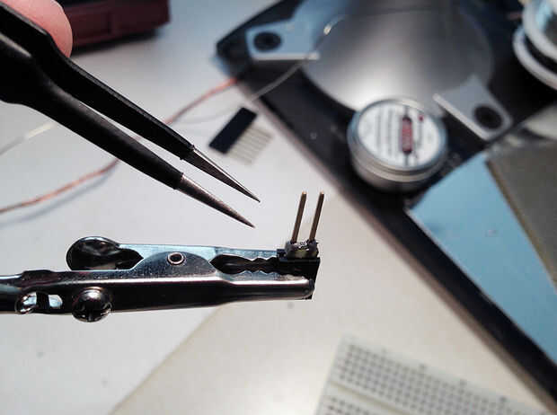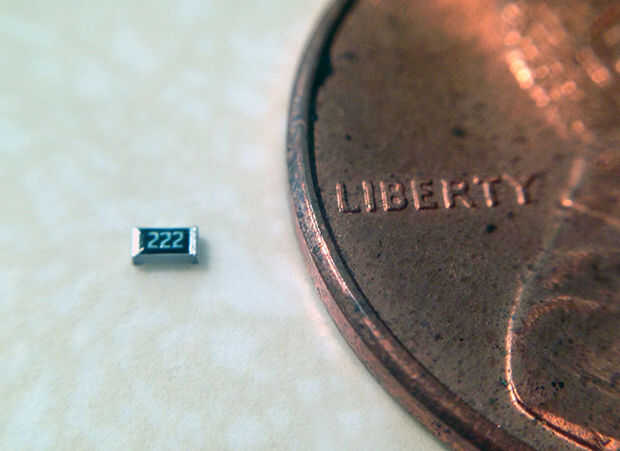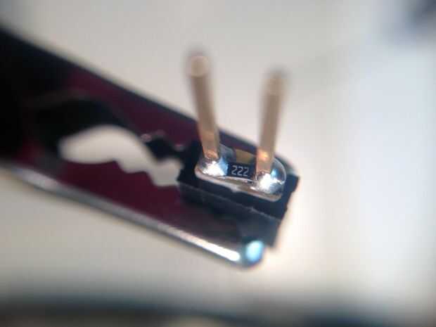 Una vez que el PCB se corta y se coloca en las piernas de la mujer encabezado, está listo para soldar las resistencias de ohm k 2,2 entre los cables. Encontré que es realmente más fácil a los lados de la resistencia junto con los lados de la cabecera de la soldadura. Ver el video aquí para un tutorial.