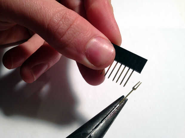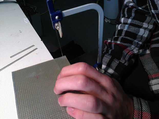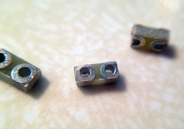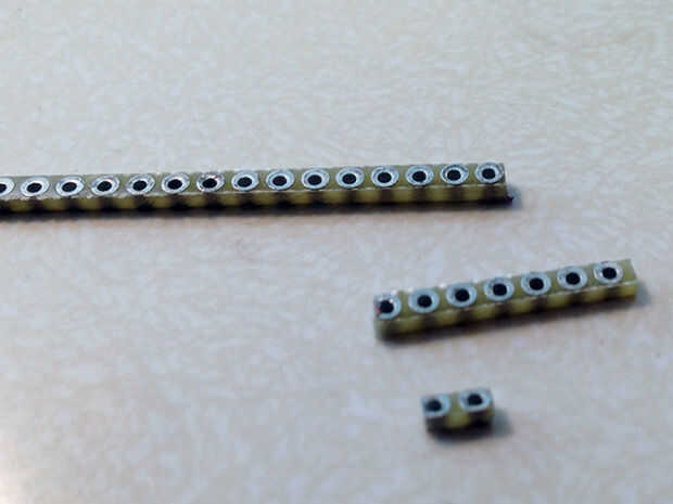 A continuación necesitarás cortar un poco de dos posiciones PCB de la placa de pan de doble cara de la soldadura (ver lista de materiales.) Solía Sierra de joyero para cortar aparte - vieron a través de PCB como la mantequilla.