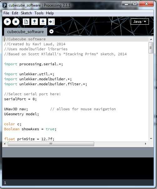 El software por Cubecube fue escrito en el proceso, un marco de bibliotecas para creativo codificación (véase http://www.processing.org/ para más información) y la plataforma de hardware de código abierto.