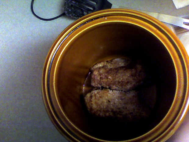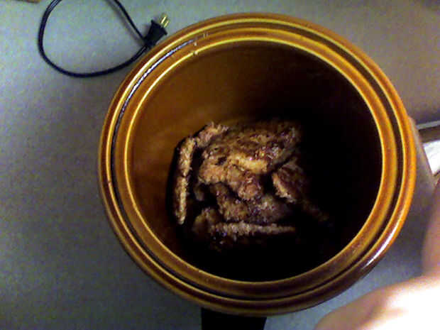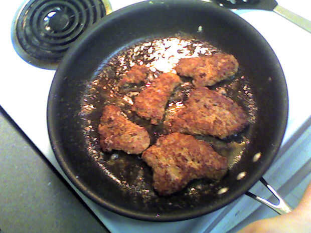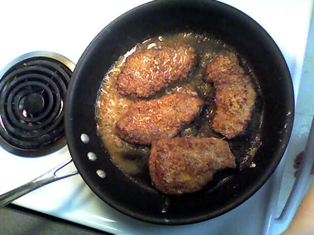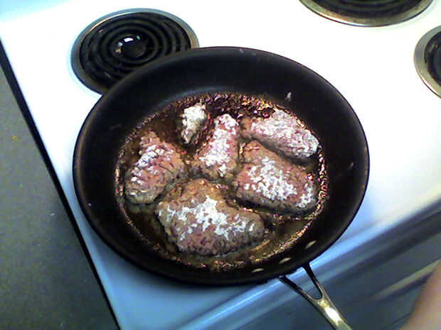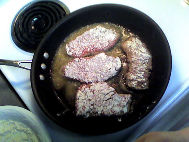 Freír la carne hasta que esté dorado y crujiente por ambos lados, teniendo cuidado de no quemar o cualquier harina que podría han caído en la sartén. Tenía a la mía en dos tandas para que no se llena en la sartén. Mueva cada lote directamente a la olla cuando haya terminado.