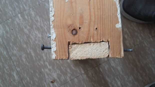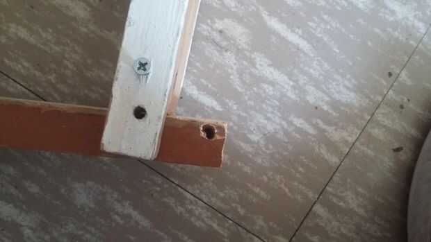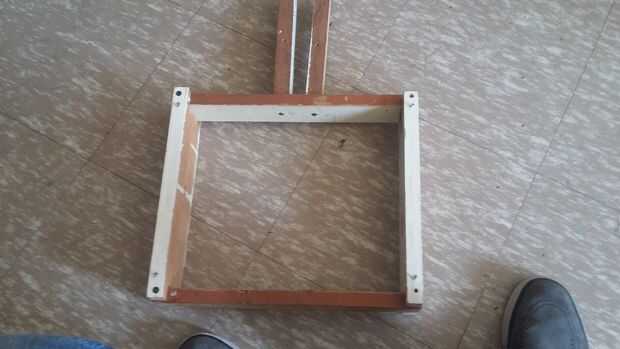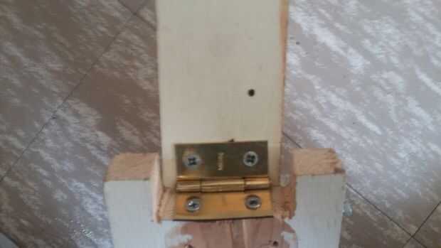 Unir la otra pieza de 35cm con una de las de 30cm con una visagra. La tabla debe formar un marco pero debe abrir asia afuera. Cerrar marco y aser un hollo de 2/8 de pulgada de ancho atraviese ambas maderas al estar cerrado de tornillo de el marco y colocar un 11 cm.
