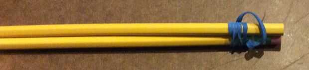 Llevar dos lápices y ponerlos de extremo a extremo. Utilizar una banda de goma en cada extremo. Una cruz sobre patrón funciona mejor.
