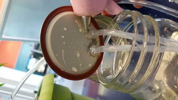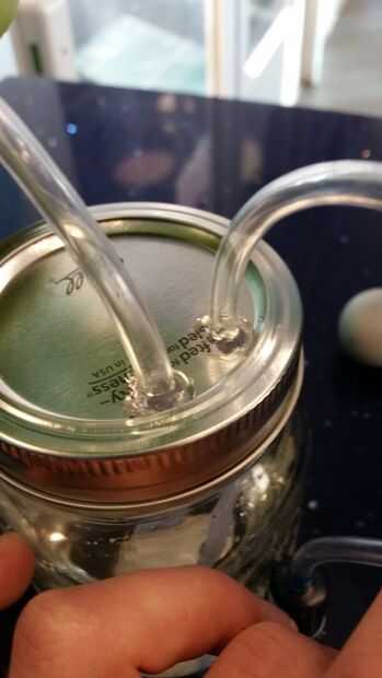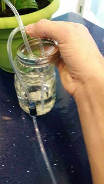 El tubo que el agua fluirá hacia arriba y fuera de la jarra debe estar en la parte inferior de la jarra. Puede utilizar una pequeña cantidad de pegamento para mantener el tubo en la parte inferior del frasco si es necesario.