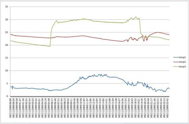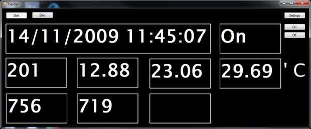 1) medir la temperatura y la luz en el espacio crece, mi habitación y el exterior, sobre todo porque los datos deben ser interesantes y definen el medio ambiente en y alrededor del espacio de crecimiento. Valores que se guardan en una base de datos (MySQL en este caso) y graficar a través de MS Excel a través de una conexión odbc. La luz y la temperatura también se utilizará como control para la luz en los puntos 2 a continuación, se enciende realmente.