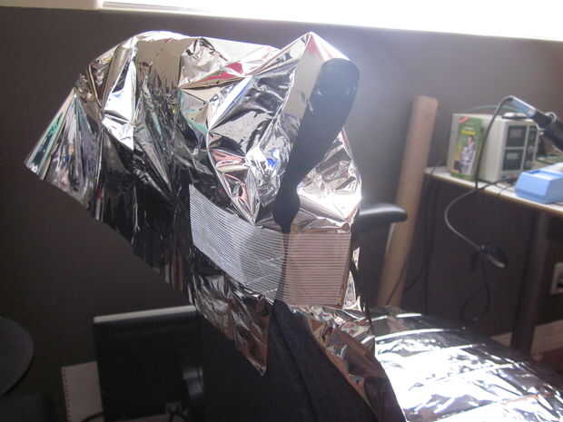 Desplegar su manta nueva brillante del espacio e inspecciónelo. Un lado será más brillante que la otra; Este es probablemente el lado conductor. Salir el multímetro y la prueba de conductividad. Un lado debe ser no conductor (el lado único poliéster) y el otro será muy conductora (el lado aluminizado). Tendrás la parte aluminizada hacia arriba en la silla para que esté en contacto con su cuerpo.