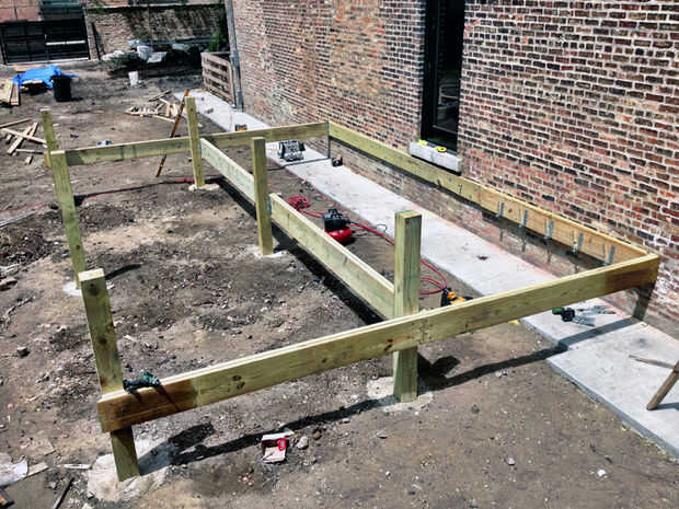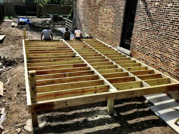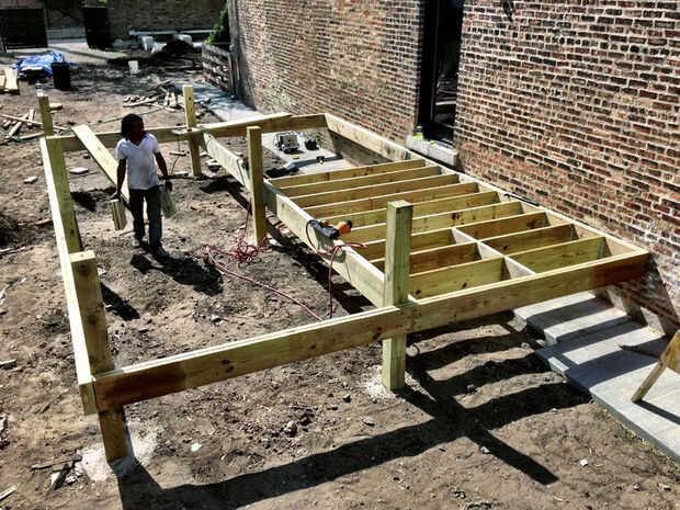 Ejecute una 2 x 12 doble hacia abajo en el centro como se muestra en la foto. Ejecutar las vigas entre el borde de la 2x10s y la viga de centro cada 16" en el centro, sujetándolos con las suspensiones de viga y comprobar el nivel de cada uno. En el medio punto (48" o algo así) en cada serie de viguetas, ejecute una línea de bloqueo para endurecer la estructura y mantener las vigas rectas.