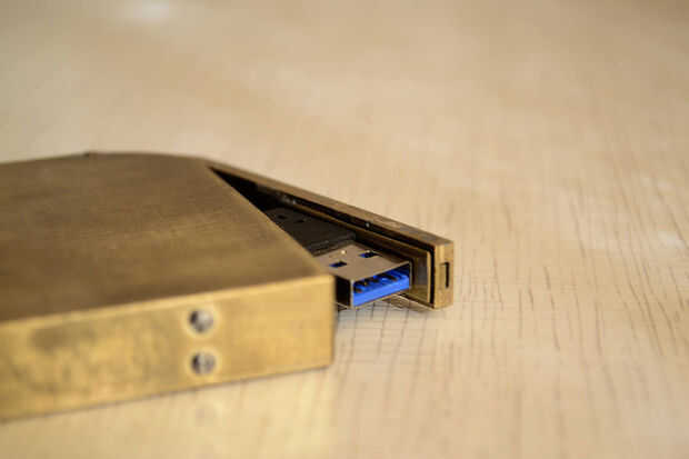 -Latón 1 m m, hecho a mano. -Bloqueo mecánico secreto. -USB 3.0 interfaz dentro (convertidor HDD sata-USB3 o + unidad de disco duro).