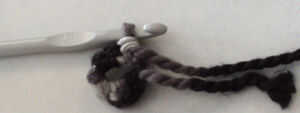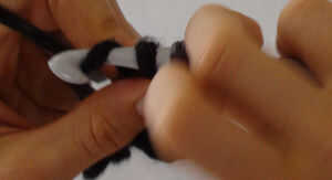 Inserte el gancho en los lazos y poner el hilo sobre el gancho y el tirón a través de hilo sobre el gancho de nuevo y tire a través de los dos lazos en el gancho.