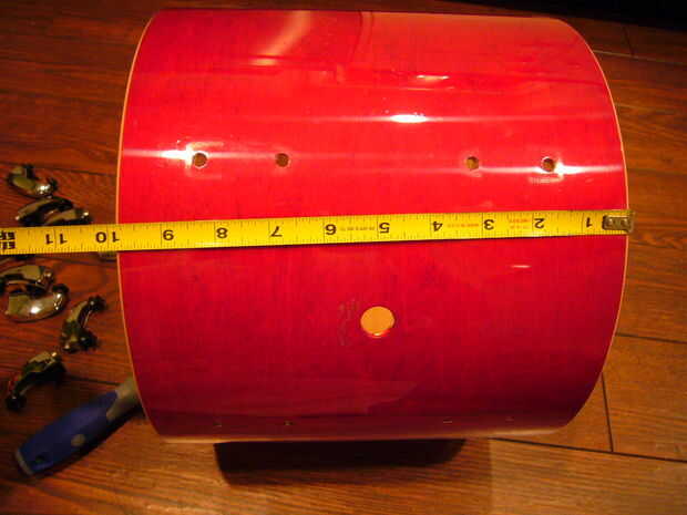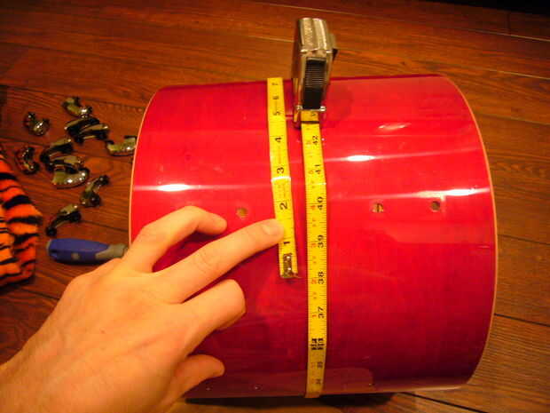 Tomar todo el hardware en el tambor. Medir la circunferencia y la profundidad del tambor. Añadir 2" a la medida de la circunferencia para que la tela se traslapa cuando envuelta alrededor del tambor.