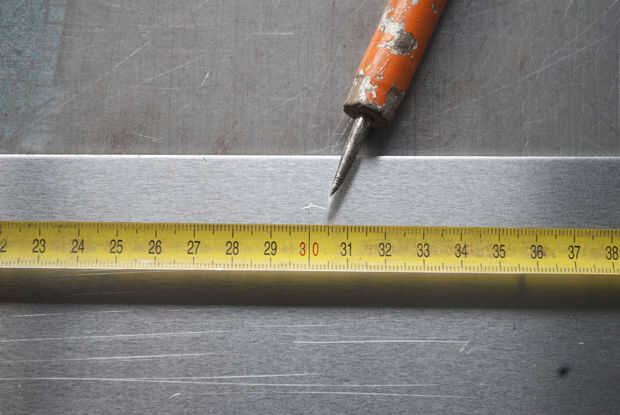 La base va a ser un plato sencillo de 30x30cm. La superficie pulida se cubre con un plástico protector. Mantenga allí tanto como sea posible. El aluminio desnudo le encanta coger las huellas dactilares. Corté el 30 x 30 de una hoja más grande, corte un lado primero y luego los otros en ángulo recto con respecto a él.