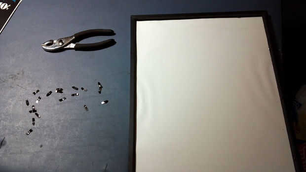 Abra sus marcos y sacar el respaldo de cartón. Con un par de pinzas, arrancar las cositas metálicas tabby que sostienen el vaso en su lugar. Luego retire con cuidado el vaso y póngala a un lado.