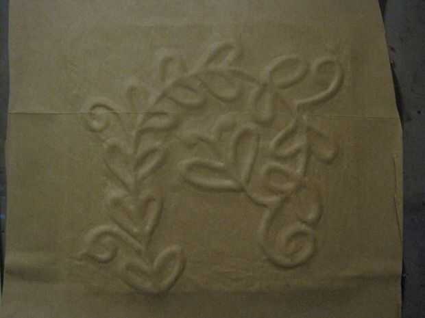 Se puede ver el diseño comienzan a surgir. Pulir con la carpeta de hueso aún más. Resista la tentación de pop los bolsillos de la cola, se ven mal y empape a través y eventualmente romper partes del papel.