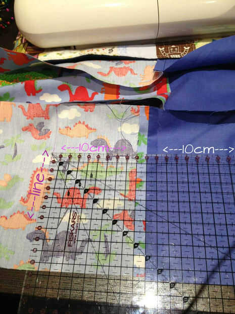 De una de las costuras de borde corto mida 10 centímetros a cada lado y trazar una línea. Doble a la tela a lo largo de cada una de estas líneas y prender.