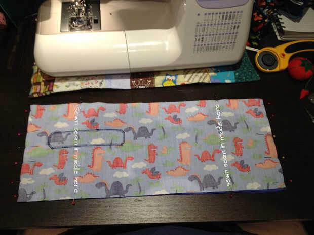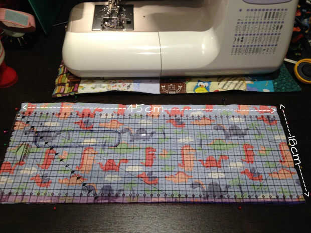 Una vez que esté satisfecho con la que línea de sus bordes plegados, prender a lo largo de los bordes laterales para sostenerlos en lugar de coser. Su pieza fijada de tejido en este punto debe ser 45cm de ancho y 18cm de altura.