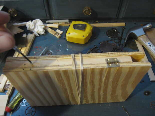 Las piezas superior e inferior deben ser hecho secado por ahora, coloque la pieza de abajo sobre la mesa (espacio potencia de abajo debe ser más cercana a usted). Alinee la pieza de arriba con la pieza inferior con la parte delantera de la cubierta en la parte superior. Tomar una banda elástica y envuélvalo alrededor de la cubierta. Gire la tapa hacia la derecha, la línea de las bisagras en el lado izquierdo. Atornillar las bisagras en la tapa. Una vez que las bisagras son atornillados, atorníllelos apagado para la pintura.